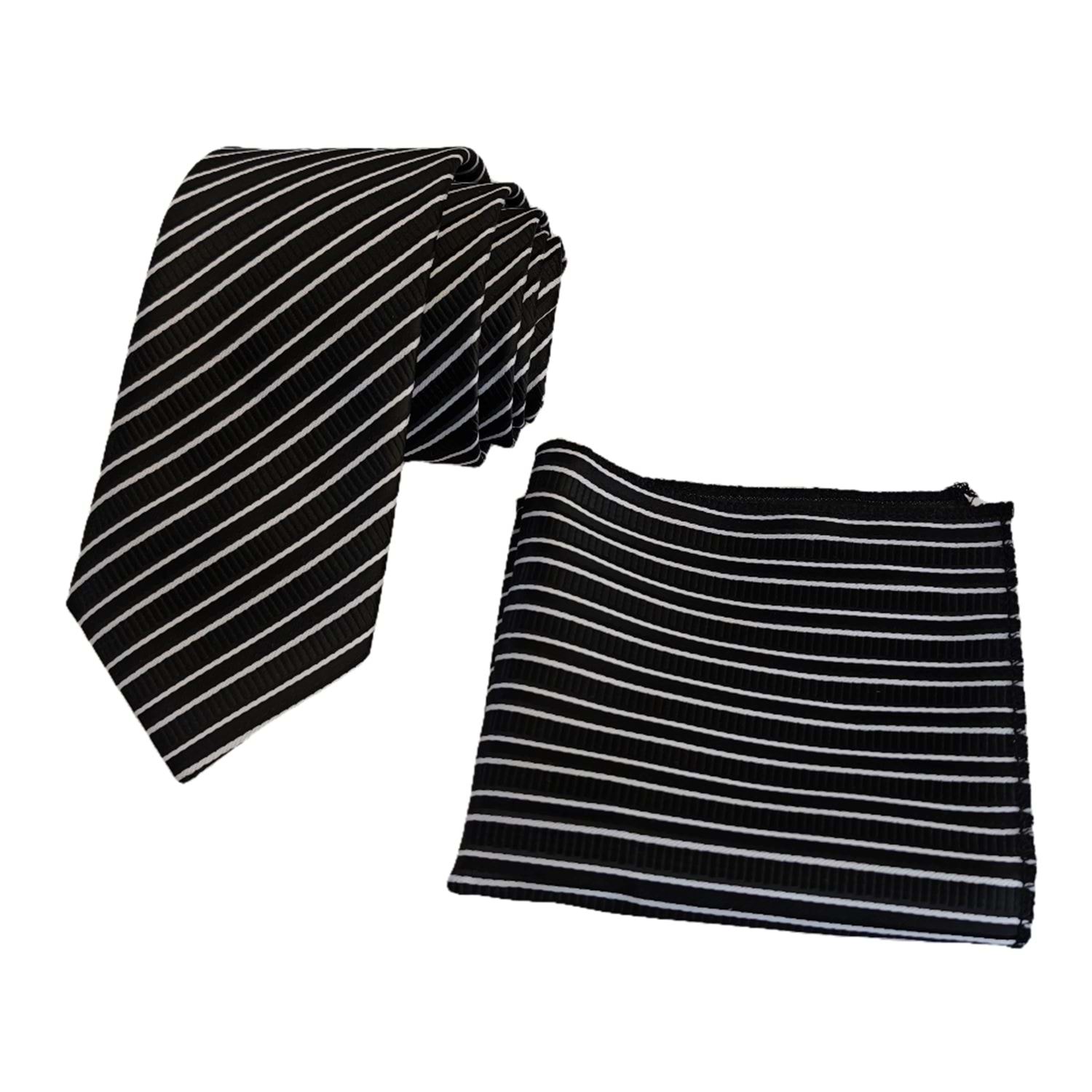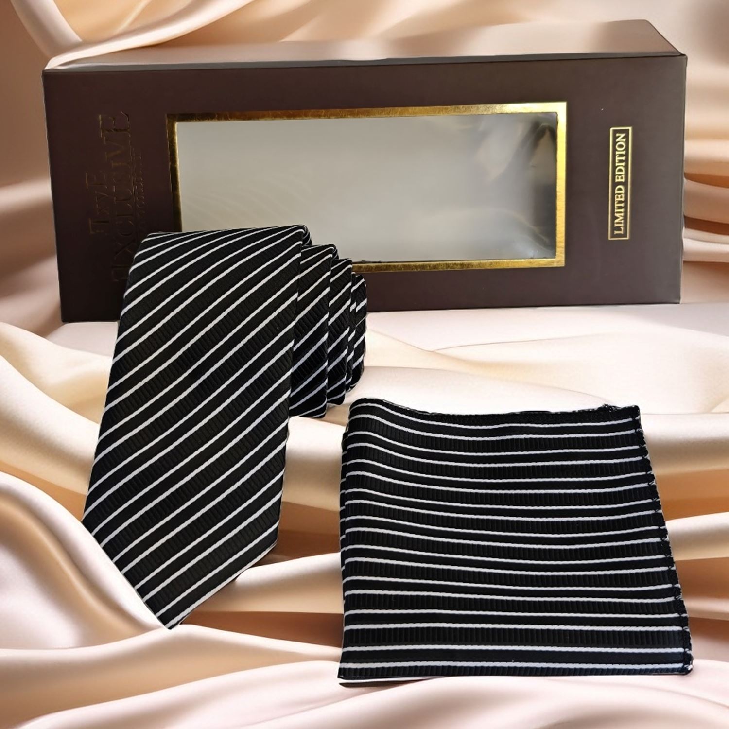 Blue White Navy Striped Tie and Pocket Square Set in Box