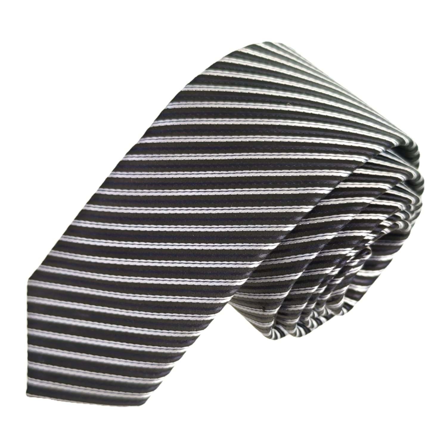Siyah Beyaz Çizgili Jakar Dokuma İnce Moda Slim Kravat