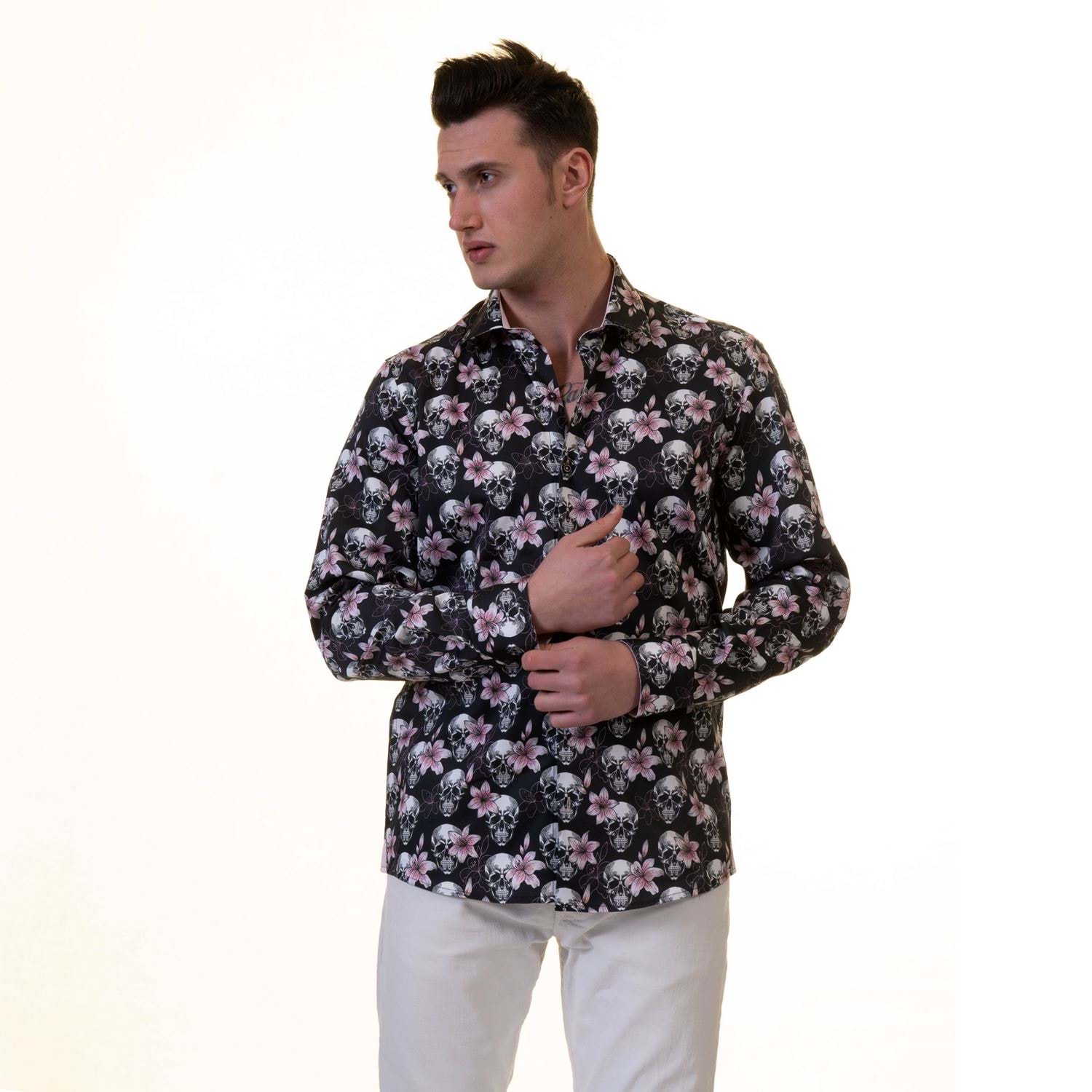 Pink Floral Skull Printed Printed Cotton Men's Shirt