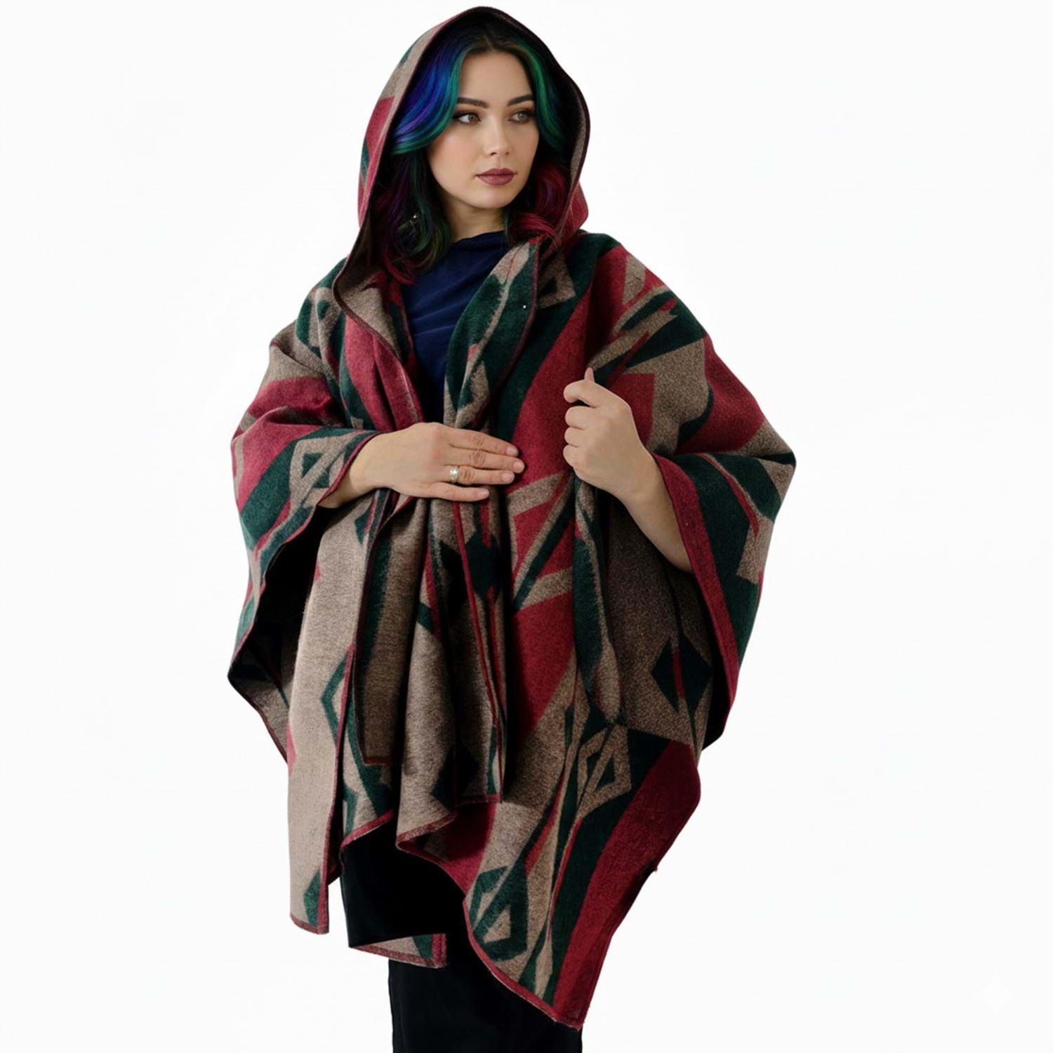 Green Beige Red Hooded Unisex Ethnic Camper Poncho